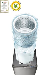 يعمل تدفق تيار الماء النظيف على تنظيف الحوضين حيث يدور الحوض المصنوع من الفولاذ المقاوم للصدأ بسرعات عالية فيما تدور الشفرات والحوض لتحريك الماء بقوة في الحوض المصنوع من الفولاذ المقاوم للصدأ وهو ما يساعد على إزالة الأوساخ من حوض الغسيل.
